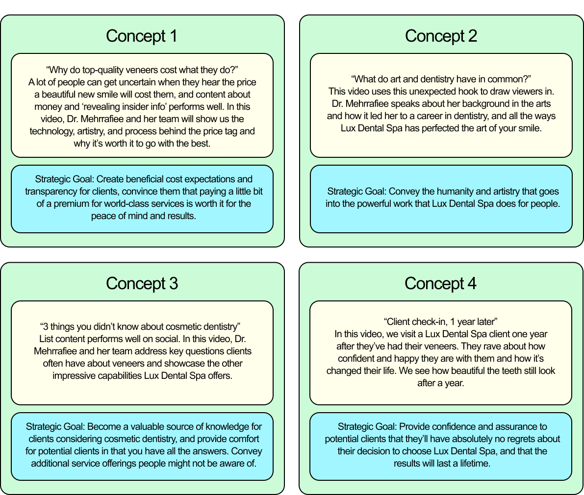 With Nathan telling me social media is the primary channel you need content for, I’ve put together some example video ideas that my team and I could execute quickly and affordably. I’m experienced in making sure every marketing concept is backed up with strategic intent that strengthens your business and ladders up to benefitting your revenues.
